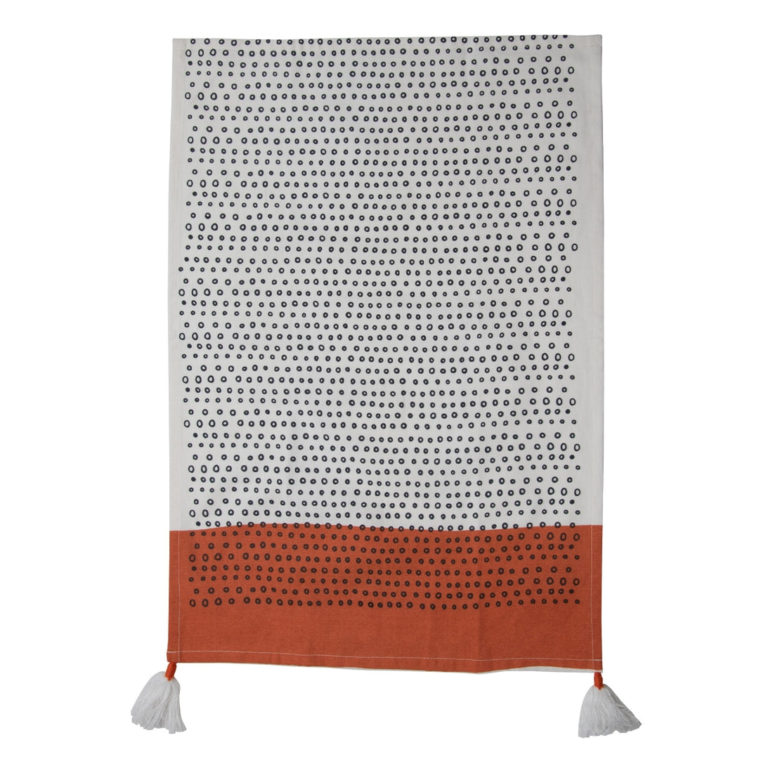 A modern take on the classic polka dot pattern with a color-blocked pop of bold, melon red, and polka dots.